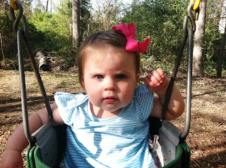 Anyhoo...I go back and forth on taking lots of pictures of the munchkin...I'll go a few days without ever pulling out my phone and then some days I'll take 20. She's at the stage now, where pics are getting harder...as she either doesn't want to sit still or definitely doesn't want to smile. But, with Mikey being gone, he likes me to send him lots of pictures...so I am trying to oblige.
